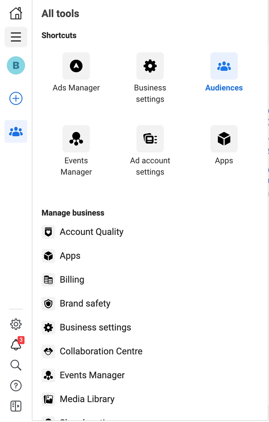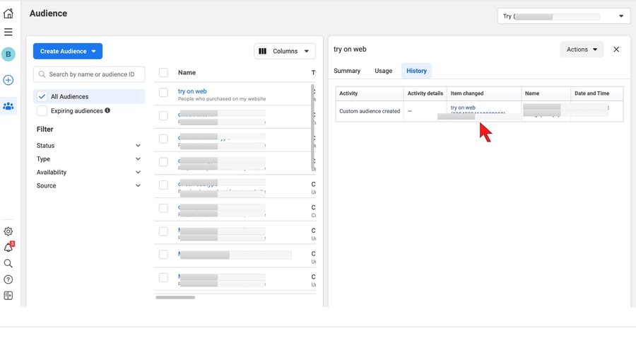 To get your Custom Audience ID, go to your Facebook Ads Manager account. On the left navigation bar, select Audiences and choose the Ad account you have created the custom audience for.